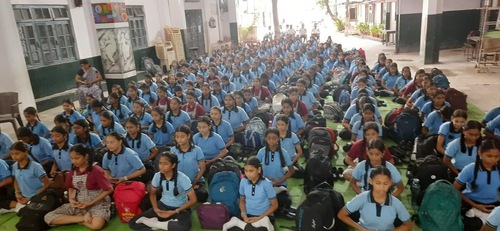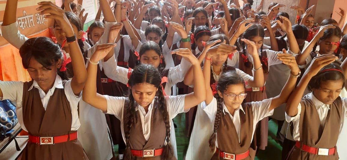 Students at Shrimati Dadibai Deshmukh Hindu Girls School meditate.