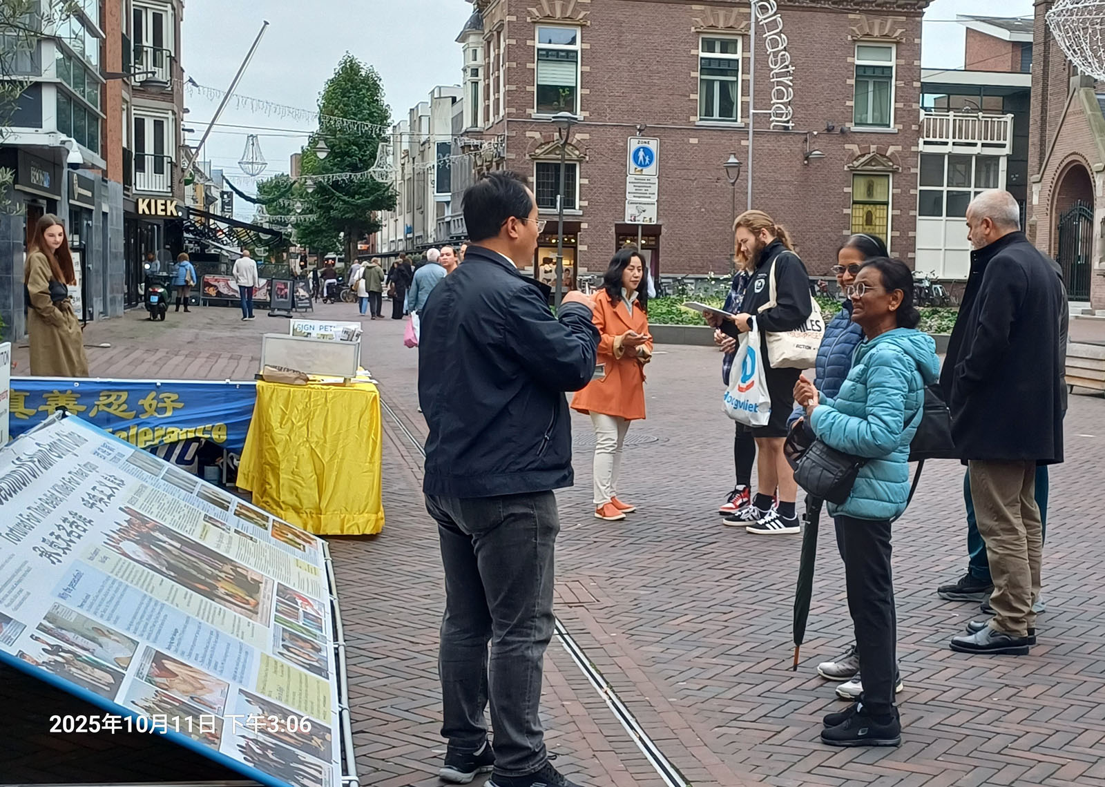 (Minghui.org) A touring information day event arrived in Alphen aan den rijn, a town in southern Netherlands, on October 11, 2025, to tell people about Falun Dafa and raise awareness of the Chinese Communist Party’s (CCP) persecution.