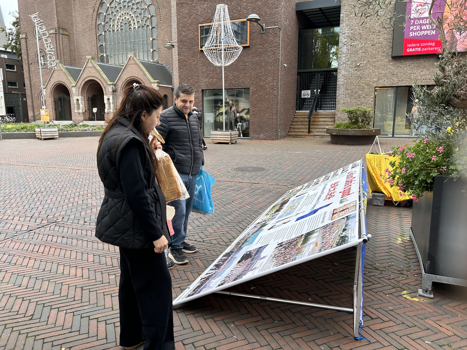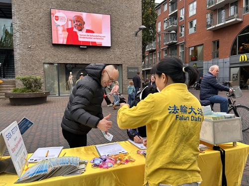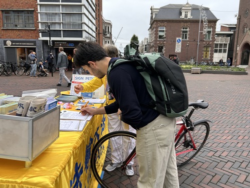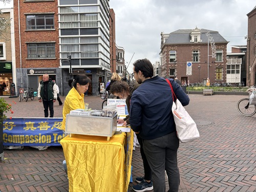 Alphen aan den rijn is a municipality in the province of Zuid Holland with approximately 120,000 residents. Practitioners set up truth-clarification display boards on Julianastraat, demonstrated the five exercises of Falun Gong, explained the persecution to the public, and collected signatures on a petition calling to end the CCP’s state-sanctioned forced organ harvesting. Several people learned the exercises on the spot.