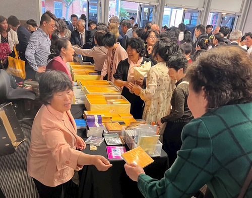 Practitioners buy Falun Dafa books at the Tianti Book Store stand during intermission of the conference.