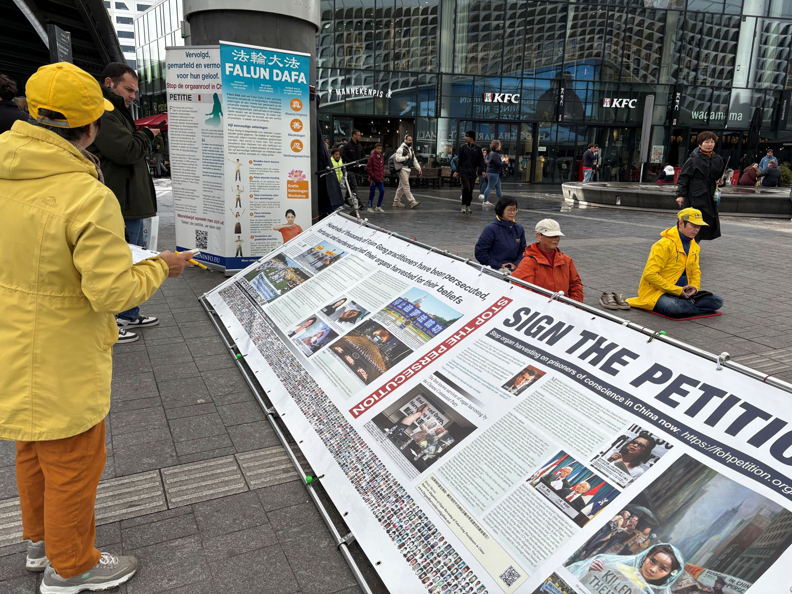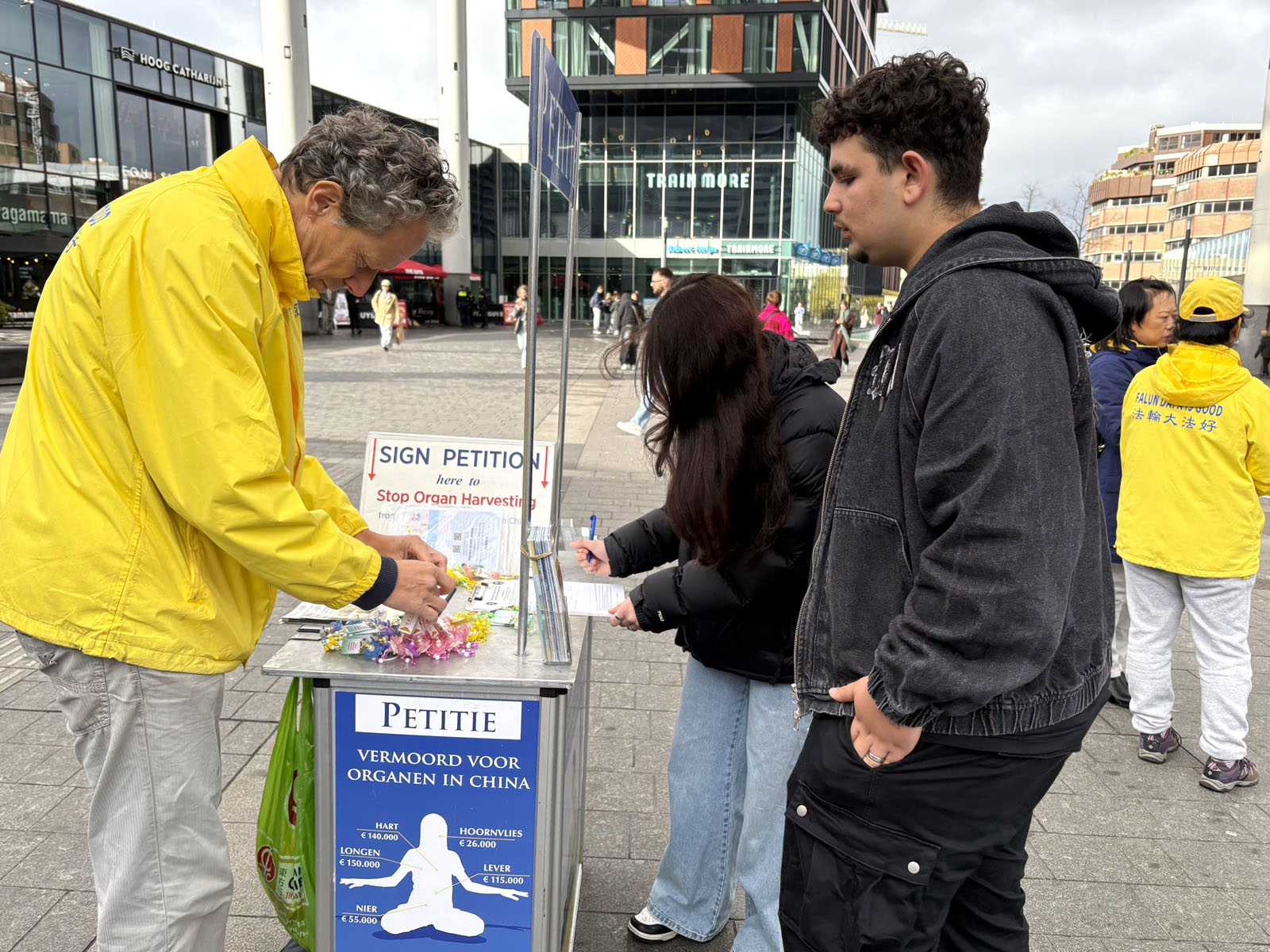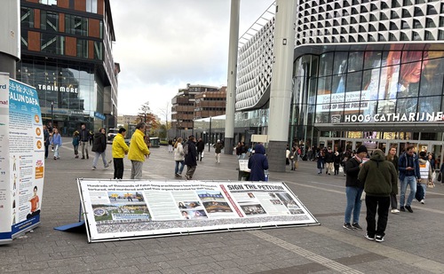 On October 26, 2025, Falun Dafa practitioners held an activity near the Utrecht Central Station to introduce Falun Dafa and raise awareness of the forced organ harvesting in China.