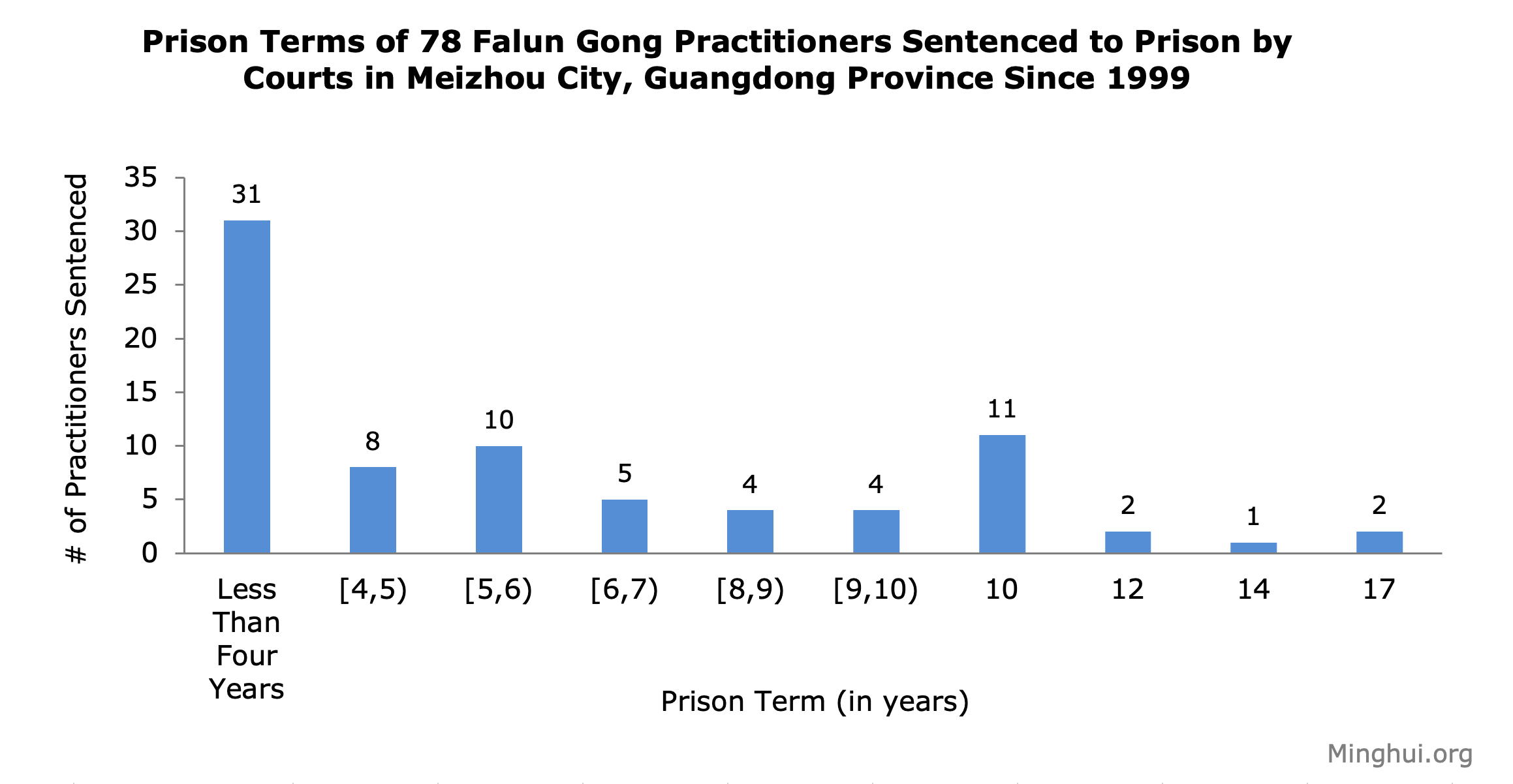 The prison sentences (totaling 94 occurrences, as 16 practitioners were twice sentenced) were handed down by eight local courts: the Meixian District Court, Meijiang District Court, Jiaoling County Court, Wuhua County Court, Xingning City Court, Dabu County Court, Fengshun County Court and Meizhou City Court.