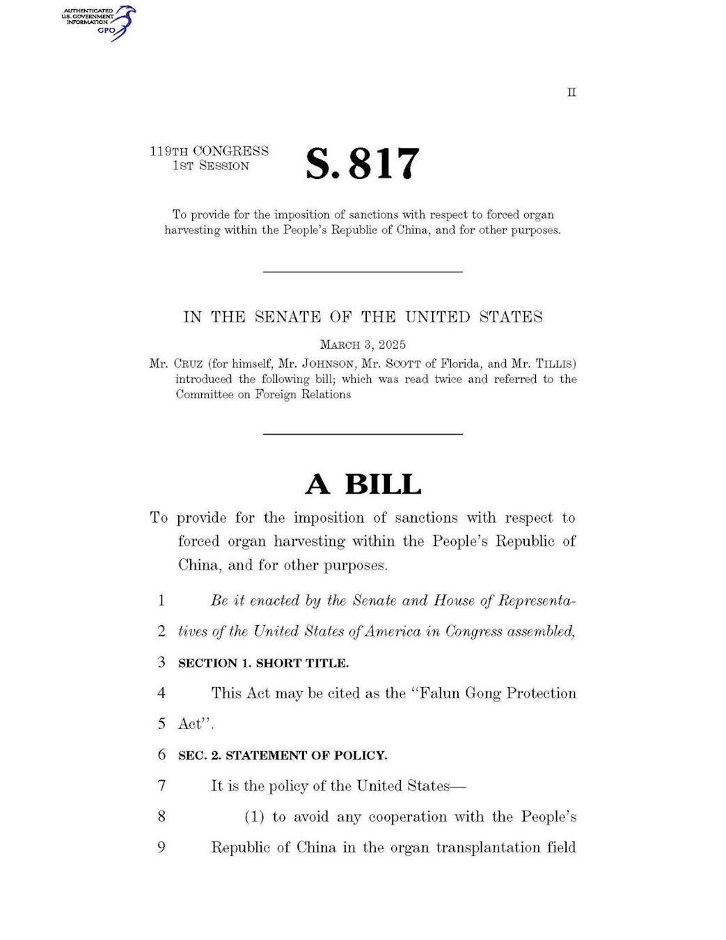 The Falun Gong Protection Act (S.817) was put forward by Senator Ted Cruz on March 3, 2025. The bill states that the Chinese Communist Party (CCP) still conducts forced organ harvesting from Falun Gong practitioners. The bill provides for sanctioning those involved in the forced organ harvesting.