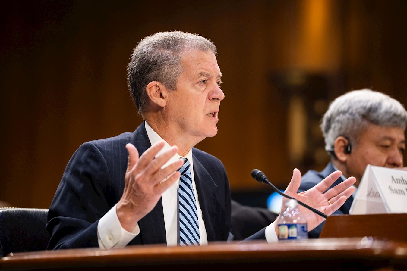 Ambassador Sam Brownback addresses the congressional hearing on religious freedom in China.