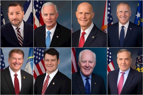 Senator sponsors of the Falun Gong Protection Act (S.817) (from left to right and from top to bottom): Sponsor Texas Republican Senator Ted Cruz, co-sponsors: Senators Ron Johnson (Wisconsin), Rick Scott (Florida), Thom Tillis (North Carolina), Mike Rounds (South Dakota), Todd Young (Indiana), John Cornyn (Texas), and David McCormick (Pennsylvania).