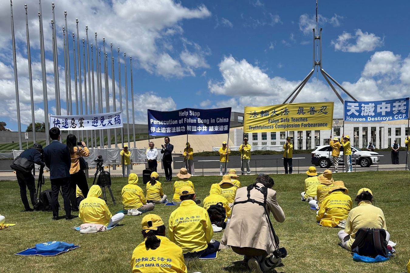 Falun Dafa practitioners held a rally in front of Parliament House in Canberra on November 24, 2025 to protest Zhao Leji’s visit.