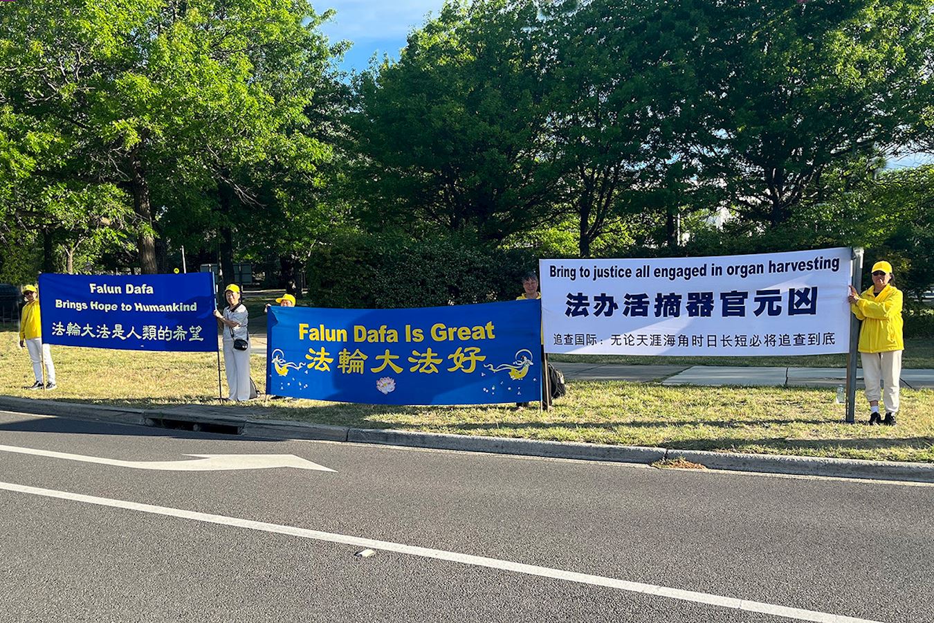 Practitioners held banners beside roads near the Chinese Embassy on November 25, 2025.