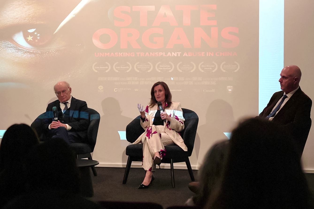 Madeleine Bridgett (middle), an Australian human rights lawyer; David Matas, Canadian human rights lawyer; and Mr. Deller attend the discussion of the documentary State Organs at the beginning of November 2025.