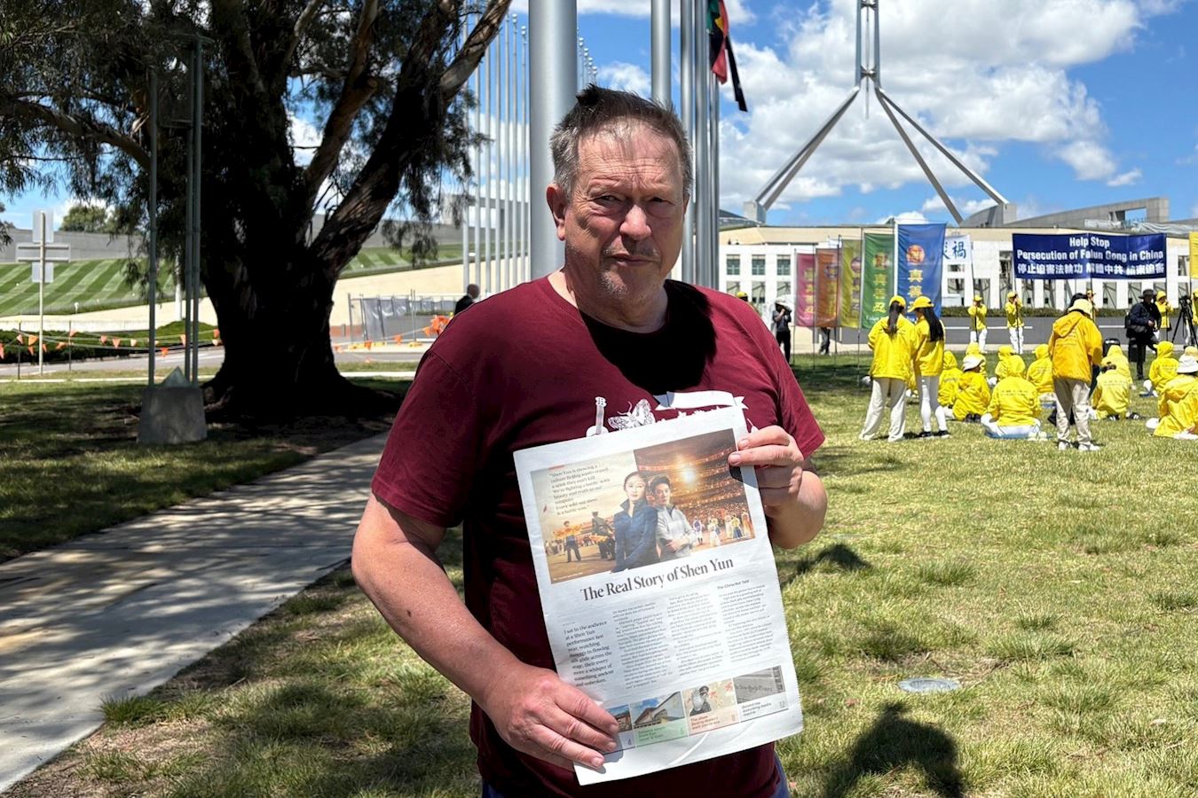 David, a Canberra resident and retired public servant, came across the event. He said he admired practitioners for their peaceful protest, “I think you’re doing very well and the way you handle yourselves in protest. I mean, it must be pretty upsetting for you to see the people representing the Chinese Communist Party here. You conduct yourselves very well and you have a very good, peaceful protest.”
