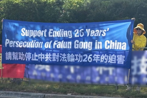 Zhao’s motorcade passed by the practitioners’ protest sites twice and saw the banners and heard the practitioners’ shouting, “Falun Dafa is good,” and “Stop persecuting Falun Gong.”