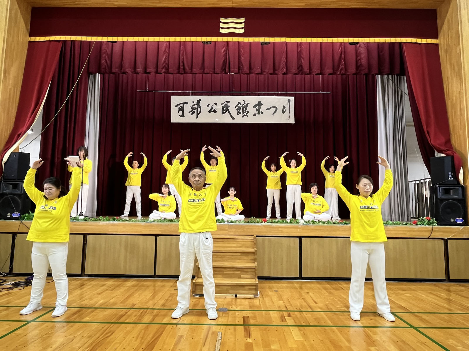 Falun Gong practitioners in Hiroshima participated in the 52nd Hiroshima City Kōbe Community Center Festival on November 2, 2025. They introduced Falun Gong on stage and demonstrated the five sets of exercises. Almost all the audience members followed along, creating a peaceful atmosphere. After the event, many people asked about local practice sites, and some offered to help practitioners.