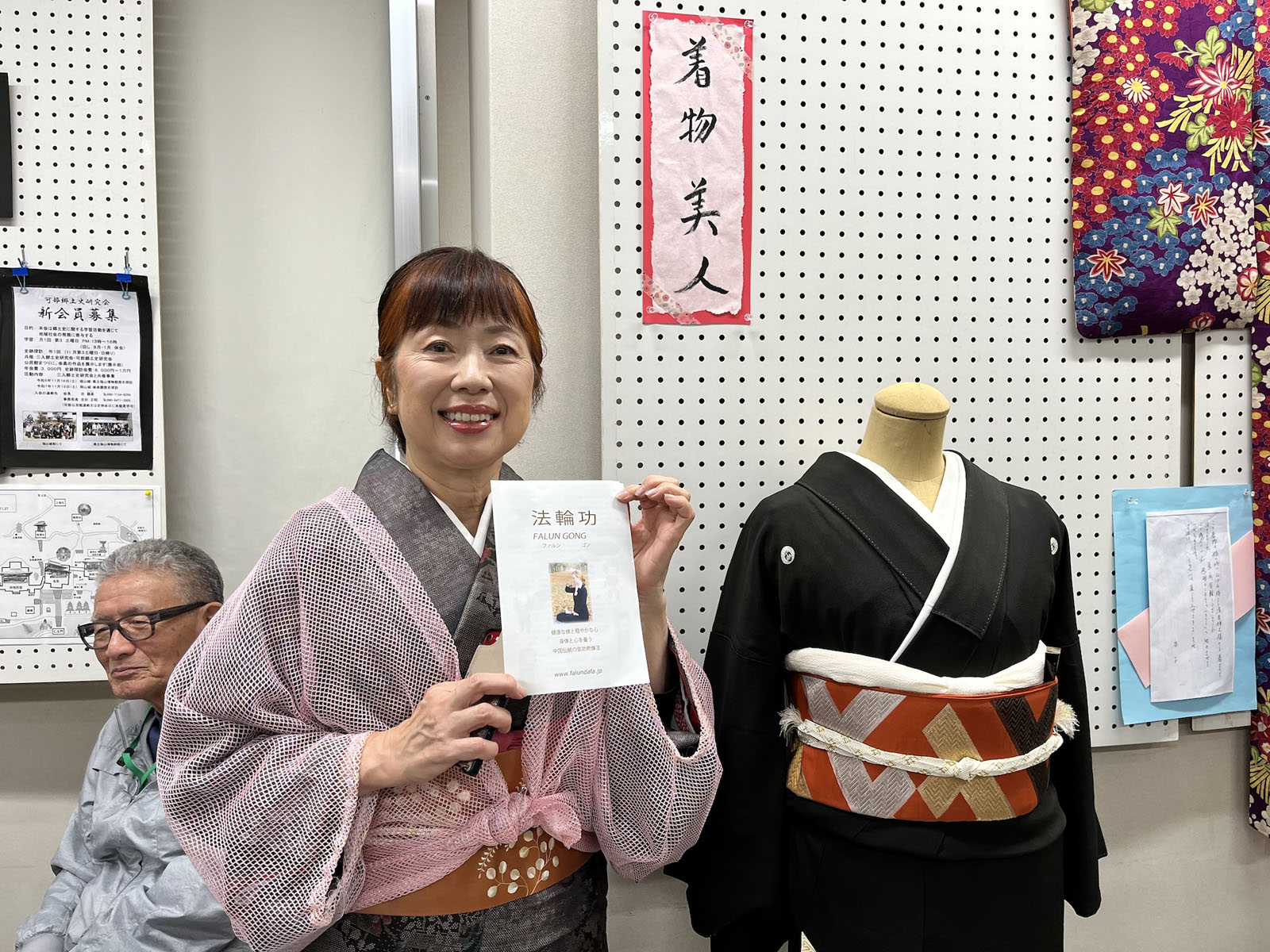 After talking to practitioners and learning about Falun Gong, Ms. Yasuda, the instructor of the “Kimono Beauty” group, said she agreed with the principles of Truthfulness, Compassion, and Forbearance. She said when she had a day off, she would go to the teaching classroom at the Kobu Community Center to learn the exercises and exchange contact information with the practitioners.
