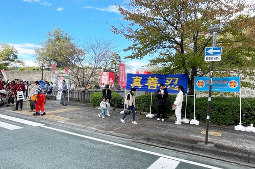 (Minghui.org) The largest street performing arts festival in Asia, the 32nd Daidogei World Cup, was held in Shizuoka from October 31 to November 3, 2025. Street performers from around the world flock to Japan to participate in the popular event. Falun Dafa practitioners distributed information about their spiritual practice and the persecution in China to residents and tourists.