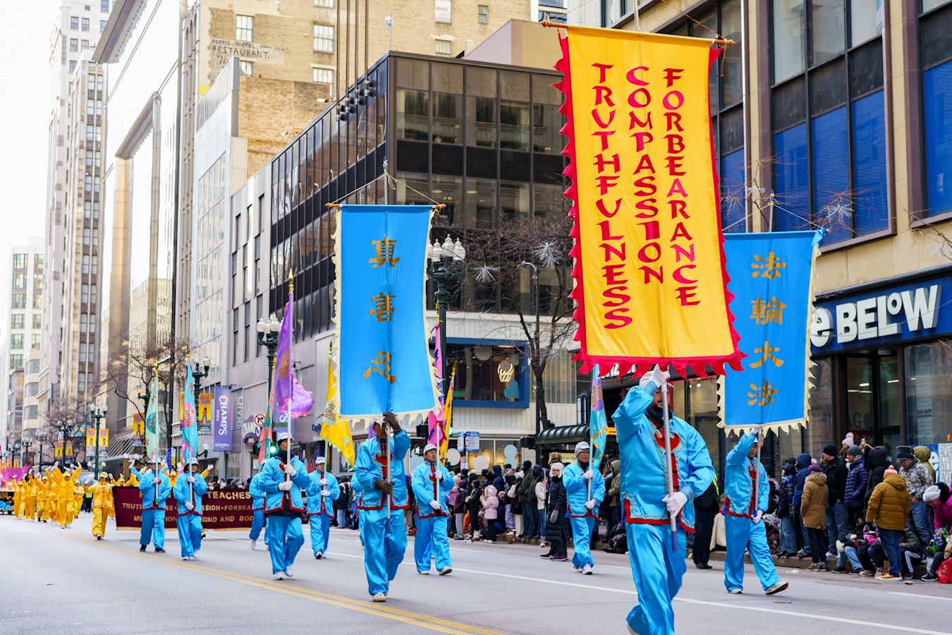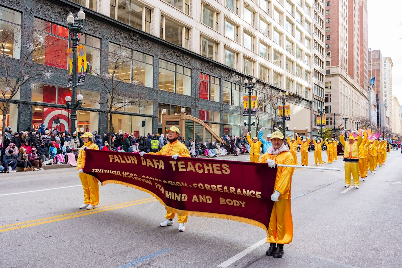 Falun Dafa practitioners participate in the Chicago Thanksgiving Parade on November 27, 2025.