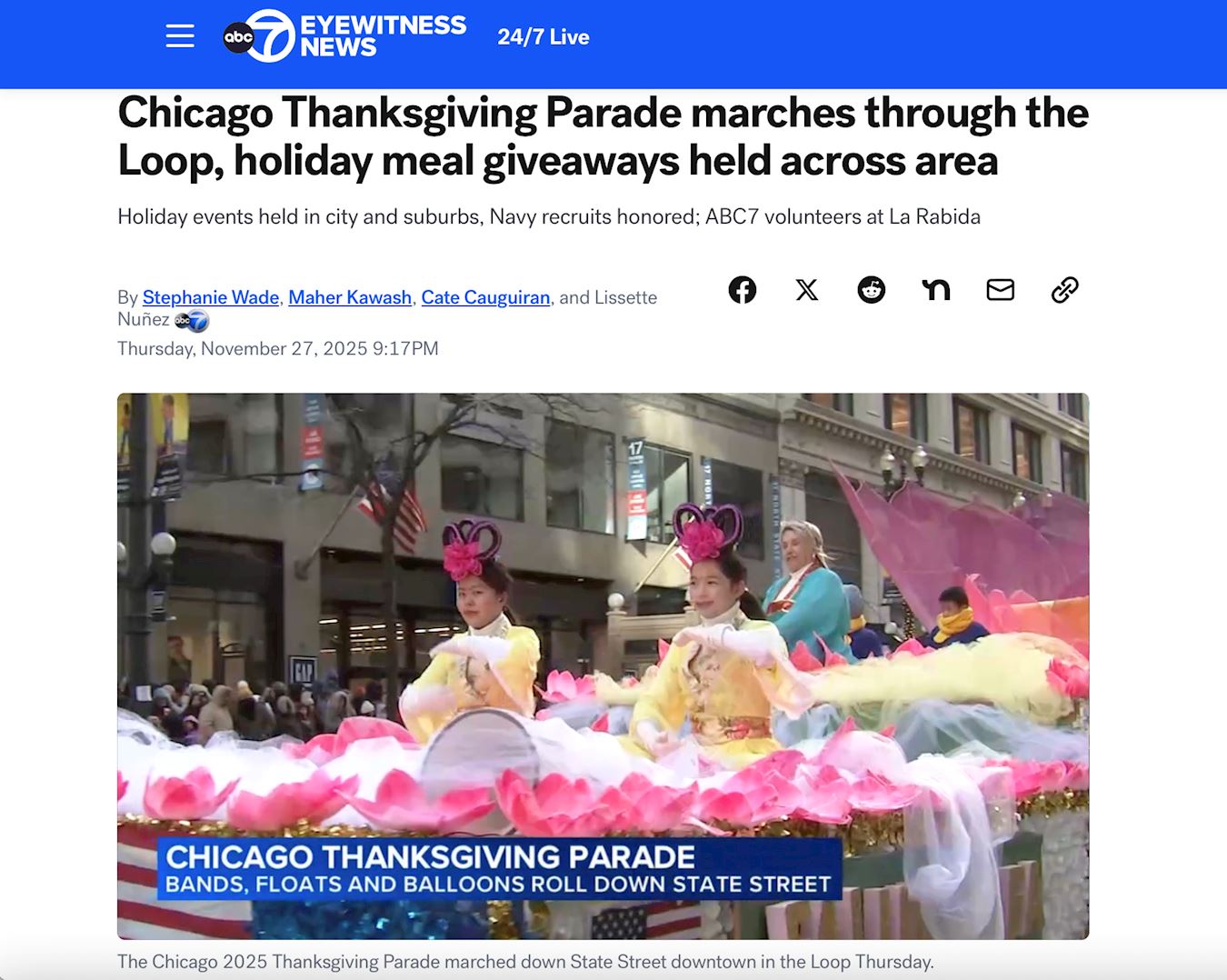 The parade was broadcast live on CBS Chicago, simultaneously aired on Pluto TV, and rebroadcast on canTV, greatly expanding the number of parade viewers. CBS Chicago, as the host of the live broadcast, used clips of the Falun Dafa entry from the 2024 parade in its 34-second trailer.