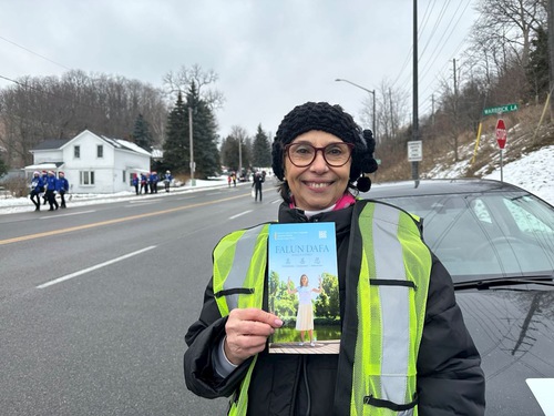 Pia also noted the banner worded, “Falun Dafa,” which was carried in front of the band. After she learned that Falun Dafa is based on the principles of Truthfulness, Compassion, and Forbearance, and that people of various ages practice it and benefit from it, Pia said, “We need to be kind and sincere, especially in the current social environment.”