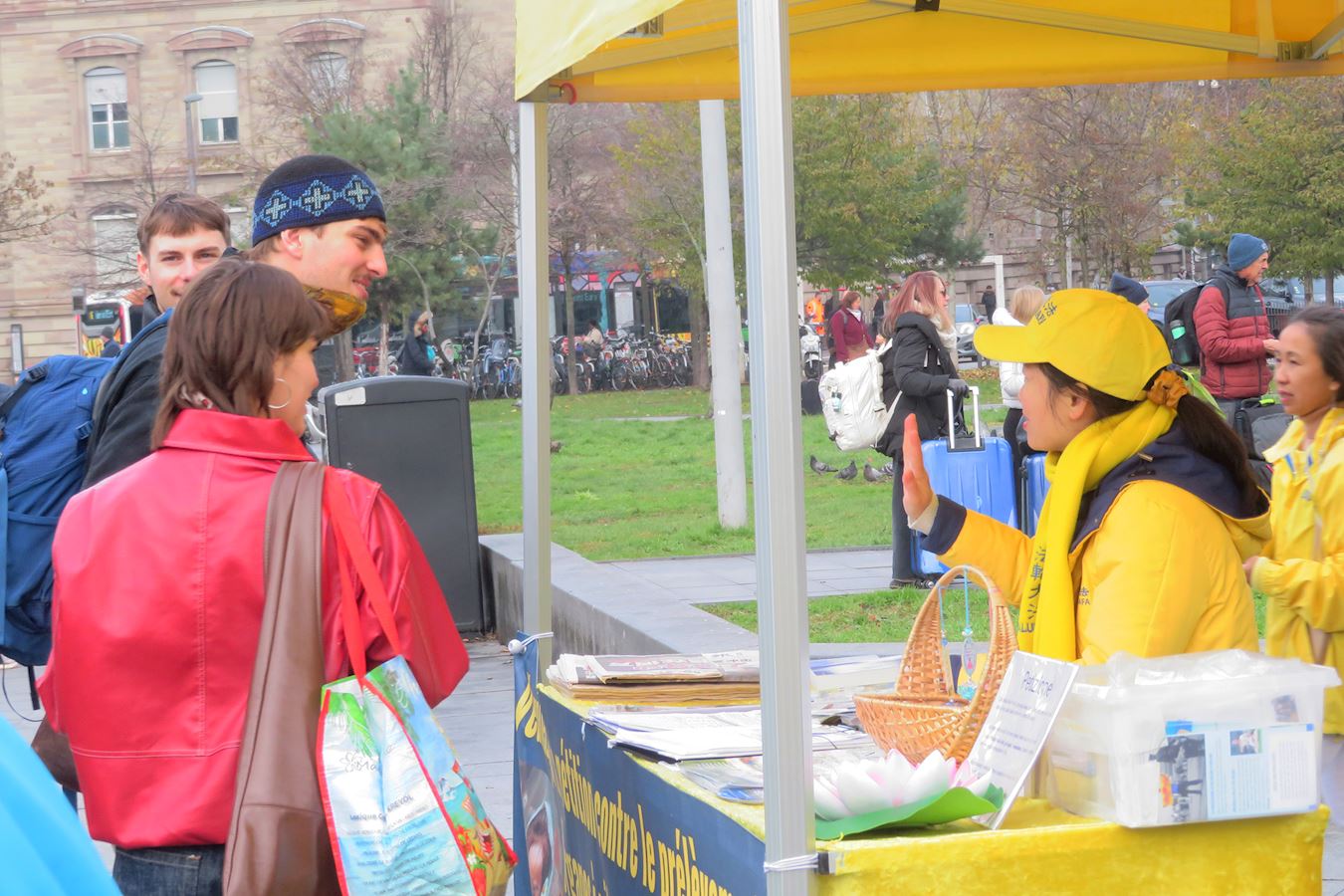 Practitioners introduced Falun Dafa on the square in front of Strasbourg’s train station from December 5 to 7. Many people signed the petition calling for an end to the persecution in China.