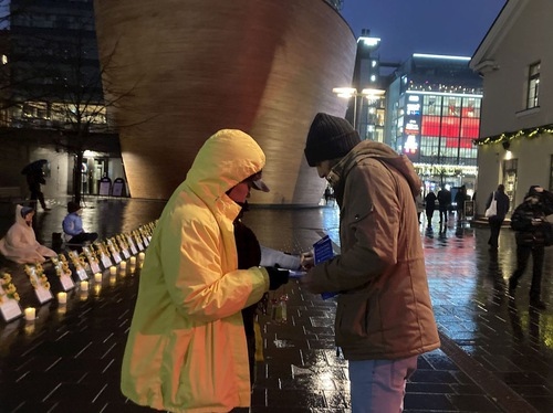 Pirkko, a Finnish artist, said she was moved by the atmosphere at the candlelight vigil. She said, “This [persecution] is horrible. I must sign the petition to support you. Everyone should have freedom.” Before leaving, she offered her sincere best wishes: “May all good things be with you. Merry Christmas!”