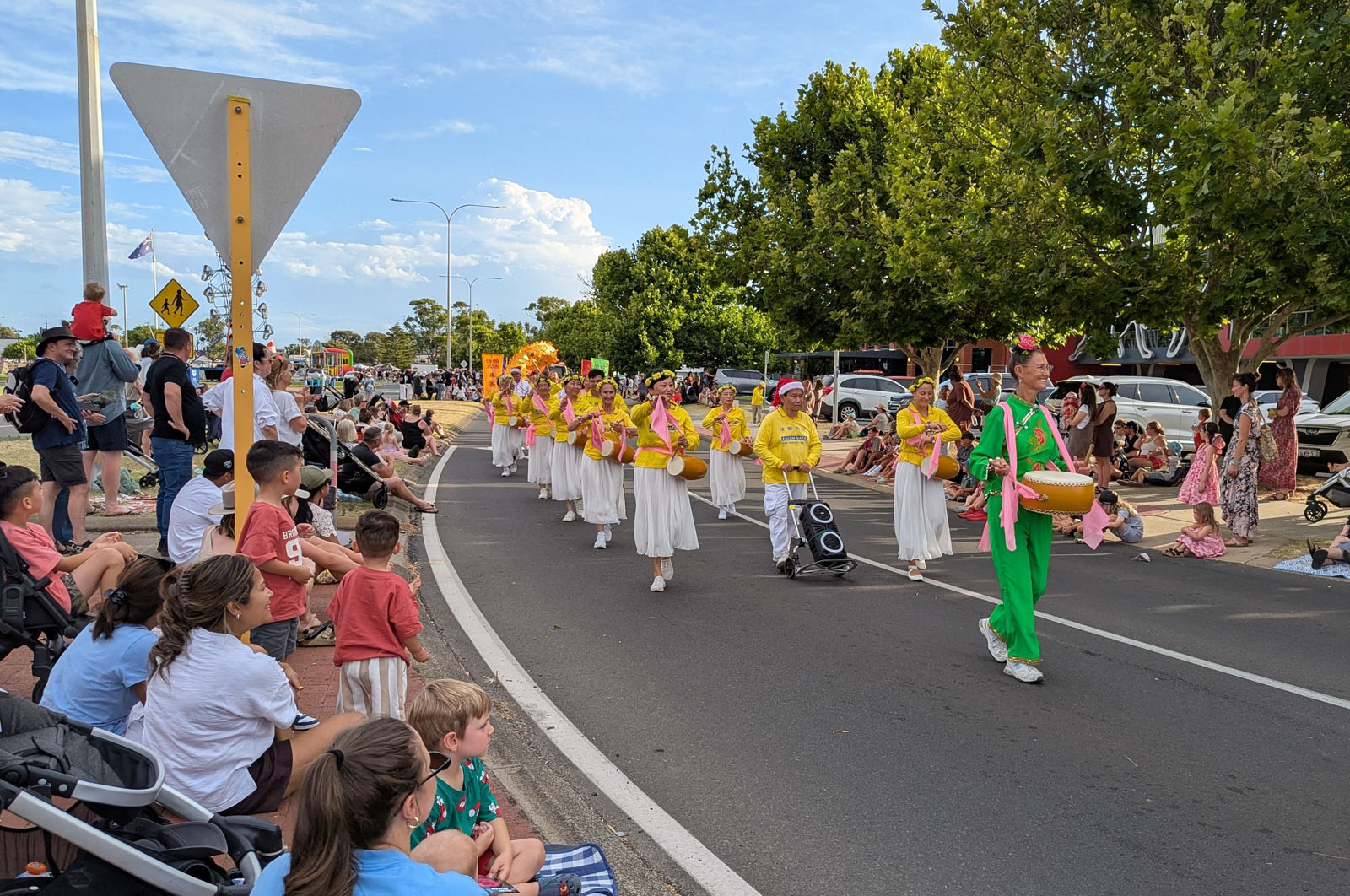 Many people praised the practitioners’ entry during the Bunbury City Christmas Parade, which was held on the evening of December 14. Their group included celestial fairies, a waist drum team, a flag team, and a Chinese dragon dance. The dazzling colors, along with the inspiring drum beats with the lively golden Chinese dragon, created a festive and auspicious atmosphere. The Chinese dragon and fairies interacted with the spectators who cheered and applauded them.