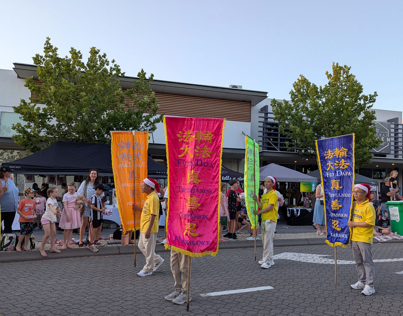 Practitioners had a booth at the Christmas festival in Ellenbrook, Perth, on Saturday, December 13, 2025. They introduced the physical and mental benefits of practicing Falun Dafa to passersby and demonstrated the exercises. Later that evening they participated in a parade and celebrated the holidays with local residents.