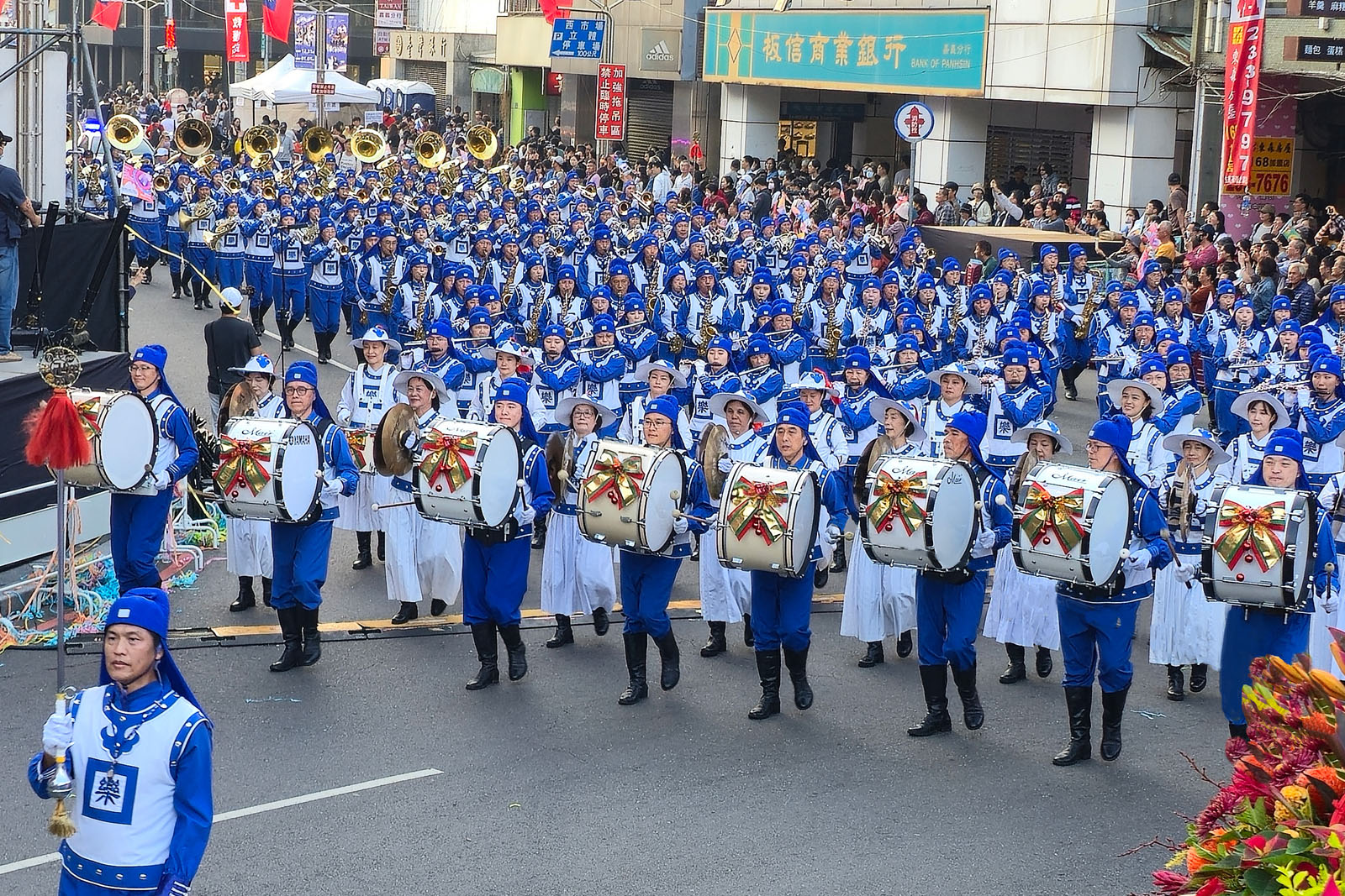 Members of the band wore blue and white Tang Dynasty costumes. The combination of traditional attire and majestic music is unique and a focal point among all the groups. Ms. Chen and Ms. Lin, who attend the festival every year, said, “Very moving! We see the band every year and call the Tian Guo Marching Band a national treasure!”