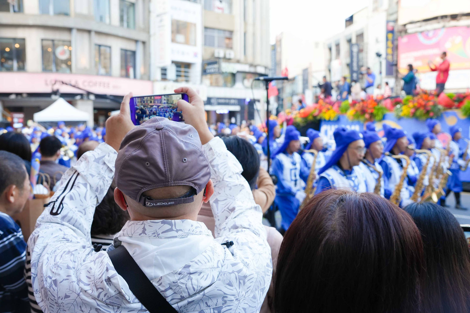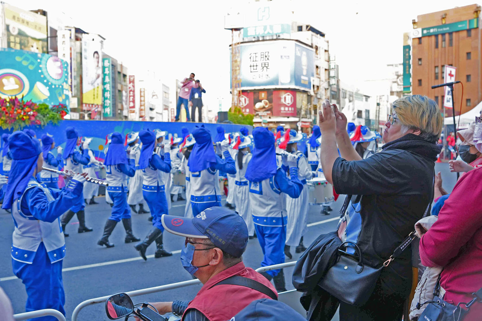 Spectators show their appreciation for the Tian Guo Marching Band. Many people took photos to remember the performance.