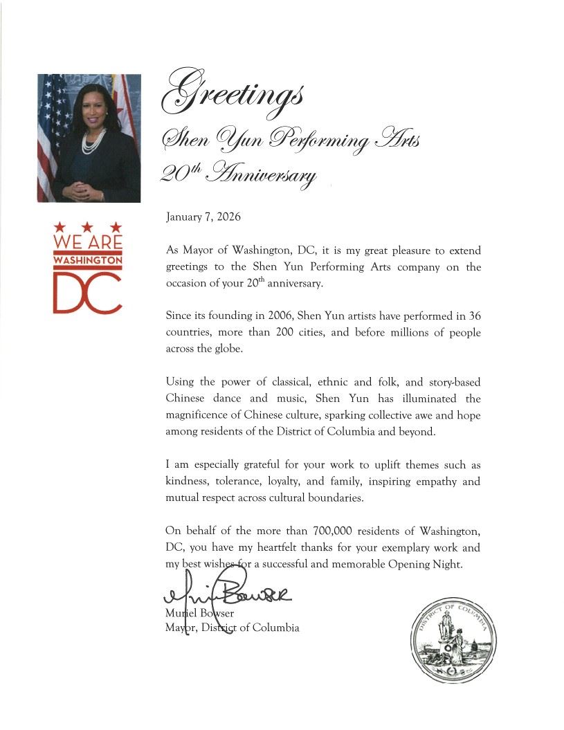 (Minghui.org) Muriel Bowser, Mayor of Washington DC, wrote a letter congratulating Shen Yun Performing Arts on the 20th anniversary of its founding. She thanked the artists for their exemplary work and illuminating the magnificence of Chinese culture.
