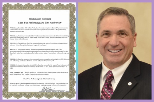 “Now, Therefore, I, Mayor Michael E. Passero, by virtue of the authority vested in me and on behalf of the City of New London, Connecticut, do hereby proclaim Shen Yun Performing Arts 20th Anniversary in the City of New London, Connecticut, encourages all residents to recognize Shen Yun Performing Arts for its artistic excellence, cultural contributions, and inspiring message of hope and compassion.”