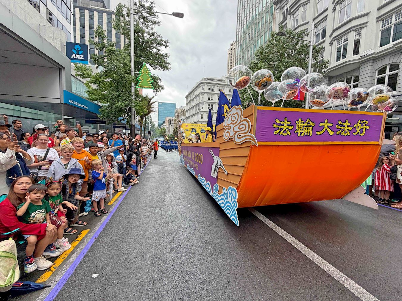 The Tian Guo Marching Band composed of Falun Dafa practitioners from New Zealand and Australia were greeted with warm applause. People took photos, complimented the band on their blue and white outfits, and said the band’s music blended perfectly with the event’s festive atmosphere. Eye-catching “Truthfulness-Compassion-Forbearance” banners decorated the float, which was followed by the dragon dance team, something the children really enjoyed.