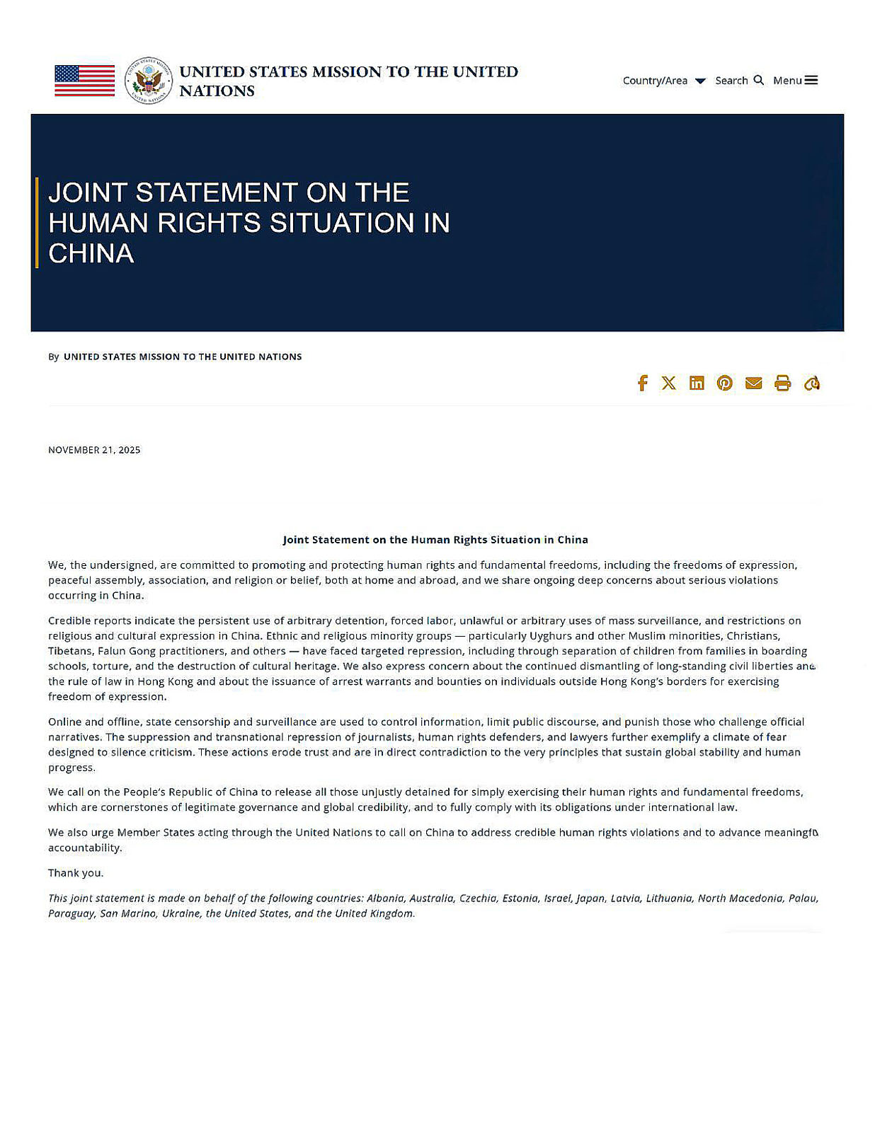 (Minghui.org) Fifteen member states of the United Nations issued a statement on November 21, 2025, titled: “Joint Statement on the Human Rights Situation in China.” The statement is also available on the United States Mission to the United Nations website.