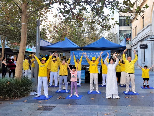 (Minghui.org) Falun Dafa practitioners in Western Australia held a rally at the Murray Street Mall in Perth’s city center on May 17, 2025. They told people about Falun Dafa, demonstrated the exercises, and gave performances to celebrate the 26th World Falun Dafa Day, which is also the birthday of Falun Dafa’s founder, Mr. Li Hongzhi. Many residents stopped to watch, and some praised Falun Dafa’s principles, Truthfulness, Compassion, and Forbearance.