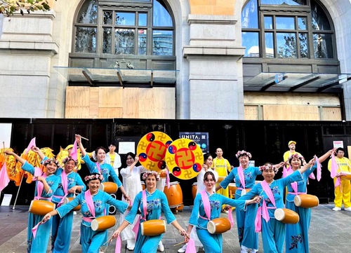 Practitioners gave a powerful drum performance, attracting passersby who took photos and videos. Afterward, practitioners performed fan dances, dragon dances, and waist drum dances, which people greeted with rounds of applause and cheers.