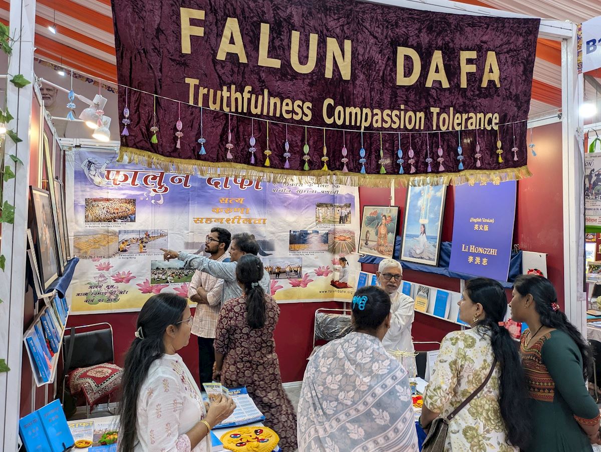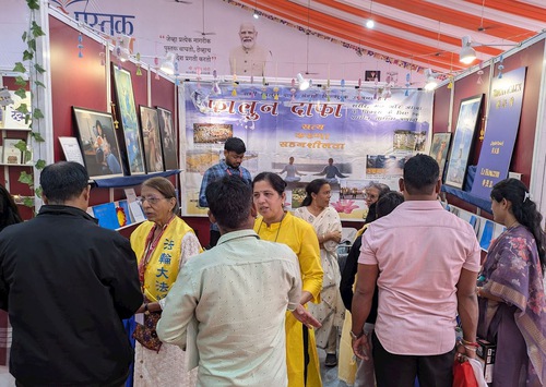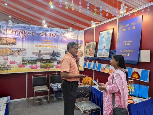 Practitioners displayed Falun Dafa books such as Zhuan Falun and Falun Gong, and some works of art from the Art of Zhen, Shan, Ren International Exhibition. Numerous book lovers and professionals from schools, colleges, the medical community, professional groups, spiritual groups, and political circles, stopped at the Falun Dafa booth to learn more. Many were impressed when they were told that Falun Dafa is taught free of charge by volunteers worldwide. A large number of visitors expressed great interest in the online volunteer-led classes in India and purchased Falun Dafa books in English, Hindi, and Marathi.