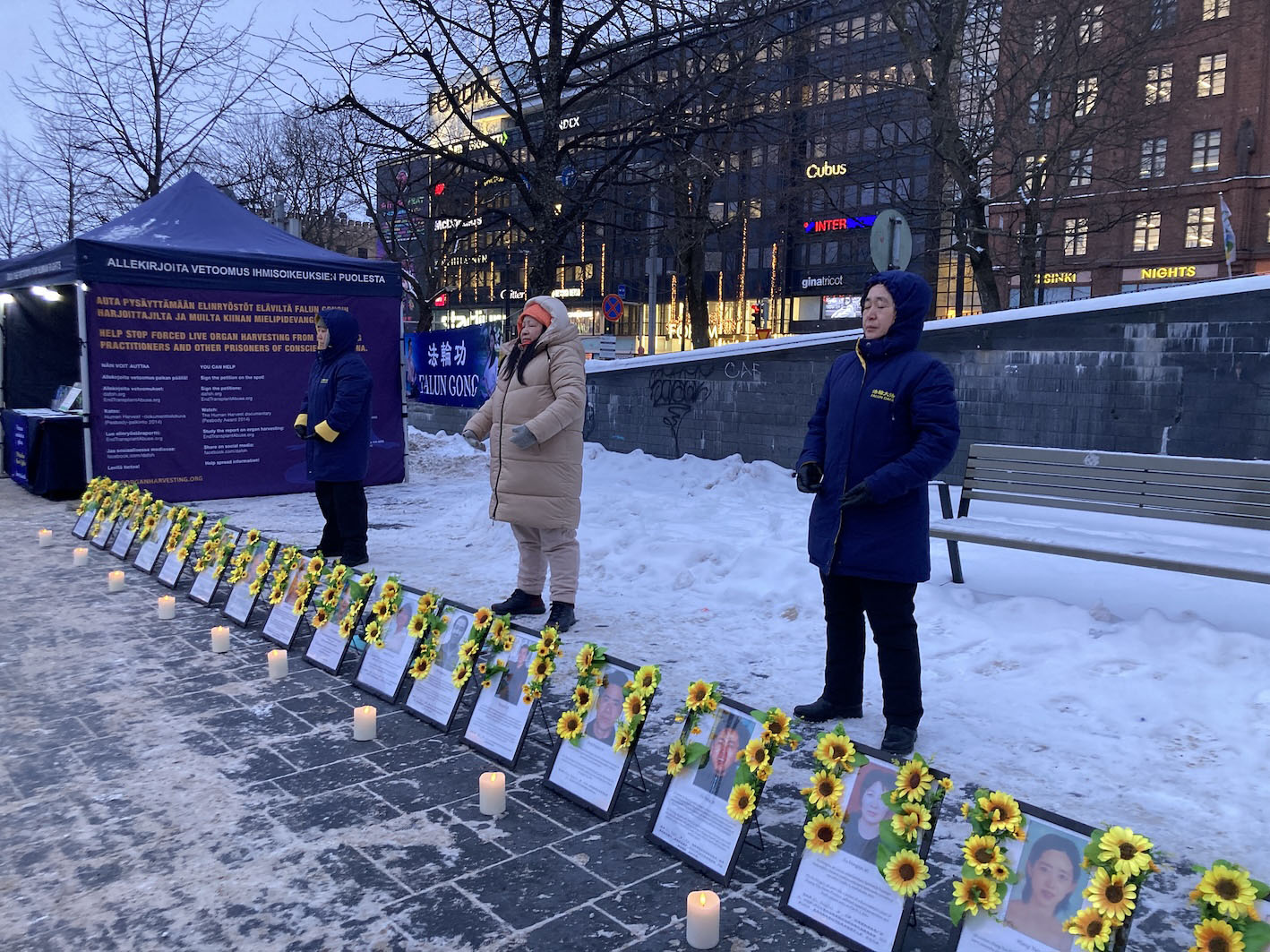 This January 27, practitioners in Finland braved minus 10-degree weather to hold a candlelight vigil to tell people the facts about the 27-year-long persecution of Falun Gong by the Chinese Communist Party (CCP). They informed passersby that this campaign has led to many practitioners being brutally tortured, injured, disabled, and even losing their lives. They let people know about the regime’s ongoing crime of organ harvesting, a crime that has involved many levels of society.