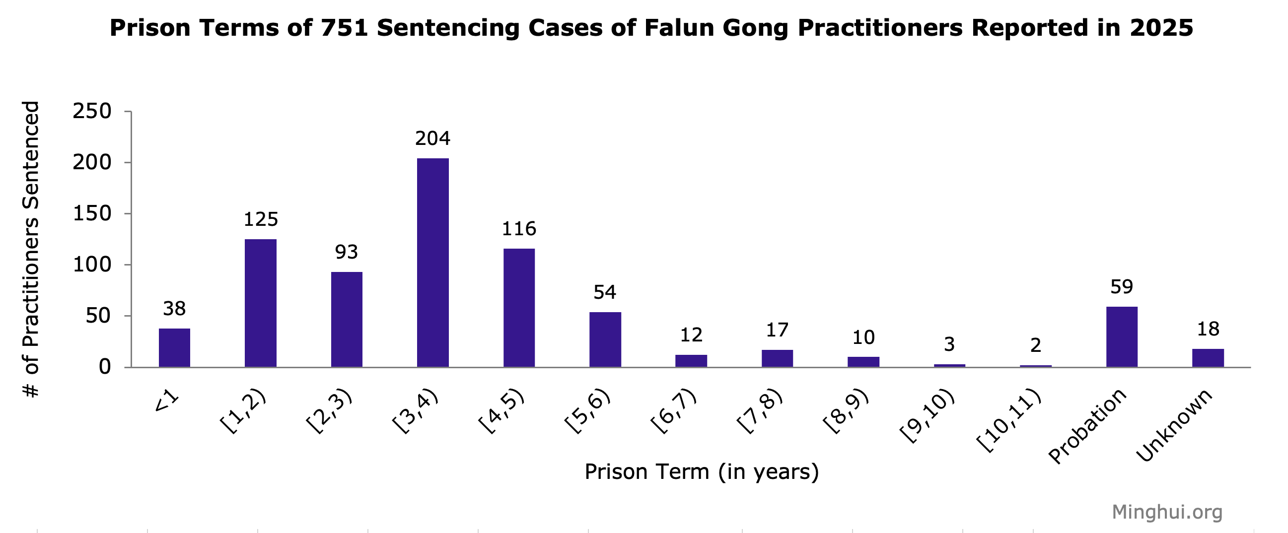 The Chinese Supreme People’s Procuratorate announced in February 2024 that in recent years, 85% of convicted criminals received three years or less, compared to 55% in 1999. Yet for the 751 sentencing cases of Falun Gong practitioners reported in 2025, 418 of them (55.7%) were sentenced to three to ten years, signifying a more severe sentencing of Falun Gong practitioners, when they violated no laws in exercising their constitutional right to freedom of belief in the first place.