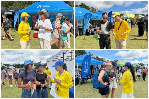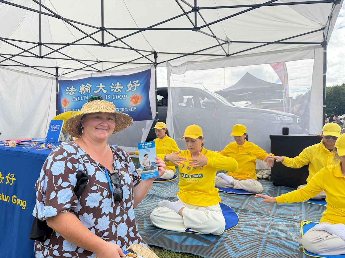 The event featured spectacular stage performances and more than 150 market stalls offering art, handicrafts, clothing, and a wide variety of foods. Amid the lively festival atmosphere, the peaceful Falun Dafa booth stood out. A steady stream of visitors stopped by to learn the exercises and about Falun Dafa. Many said that, even though they did the exercises only briefly, they felt a renewed sense of inner balance and kindness.