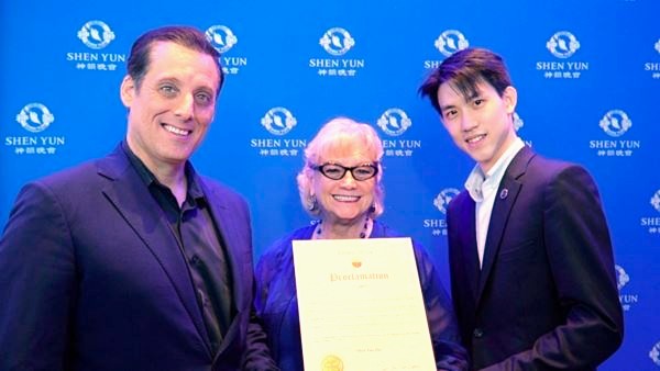 Tomball Mayor Lori Klein Quinn presented a proclamation to Shen Yun artists at the CFISD Visual and Performing Arts Center on February 15. (Screenshot courtesy of NTD)