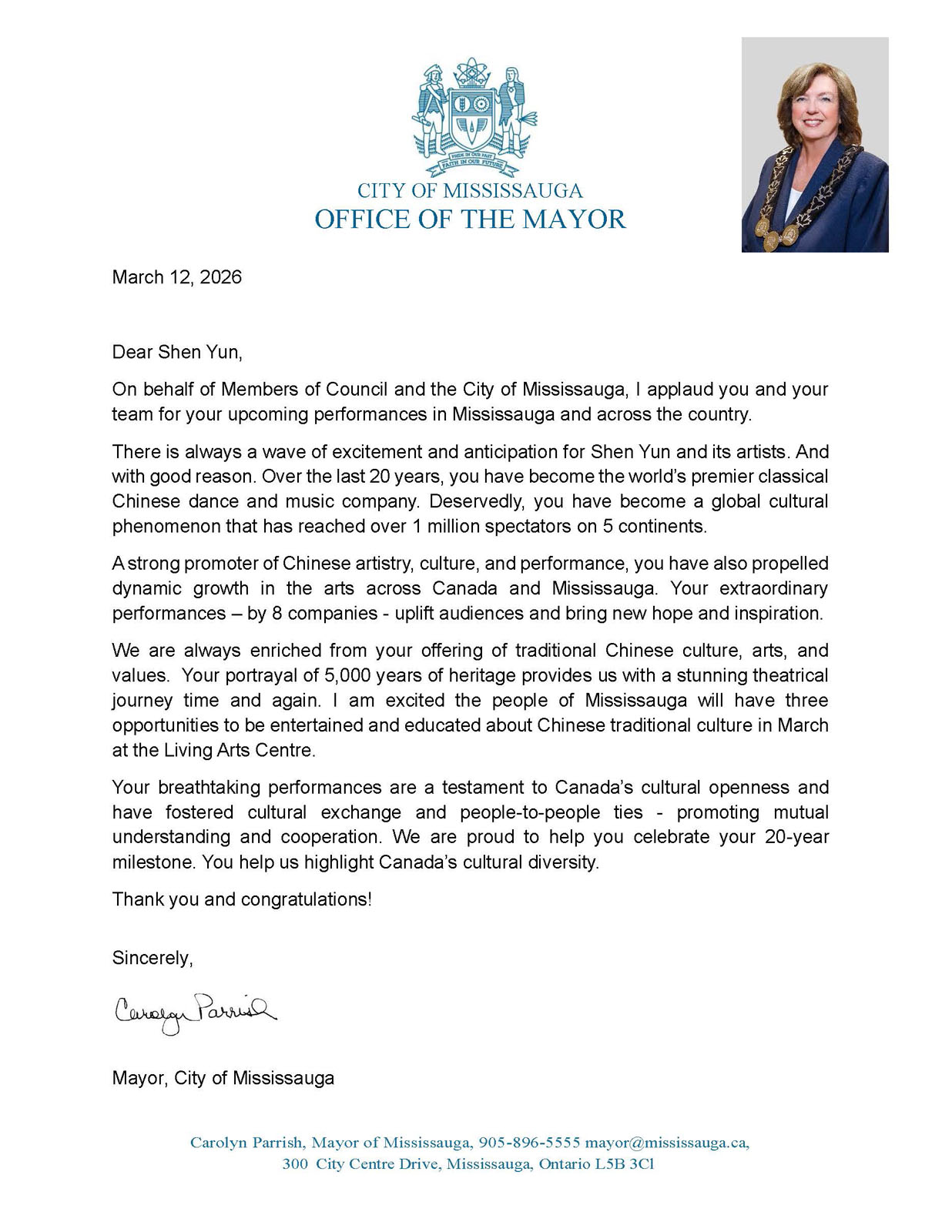 “A strong promoter of Chinese artistry, culture, and performance, you have also propelled dynamic growth in the arts across Canada and Mississauga. Your extraordinary performances – by 8 companies - uplift audiences and bring new hope and inspiration,” she continued in a letter. “Your portrayal of 5,000 years of heritage provides us with a stunning theatrical journey time and again.”