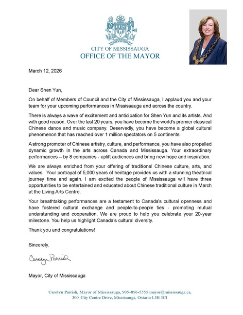 (Minghui.org) World-renowned Shen Yun Performing Arts arrived in Canada on March 12, 2026 for a 21-show tour, which started in Hamilton, Ontario. Prior to the performances, elected officials at various levels issued proclamations or sent congratulatory letters to welcome Shen Yun’s return to Canada. They congratulated Shen Yun on its 20th anniversary and wished the company great success. Numerous officials attended the shows and presented proclamations.