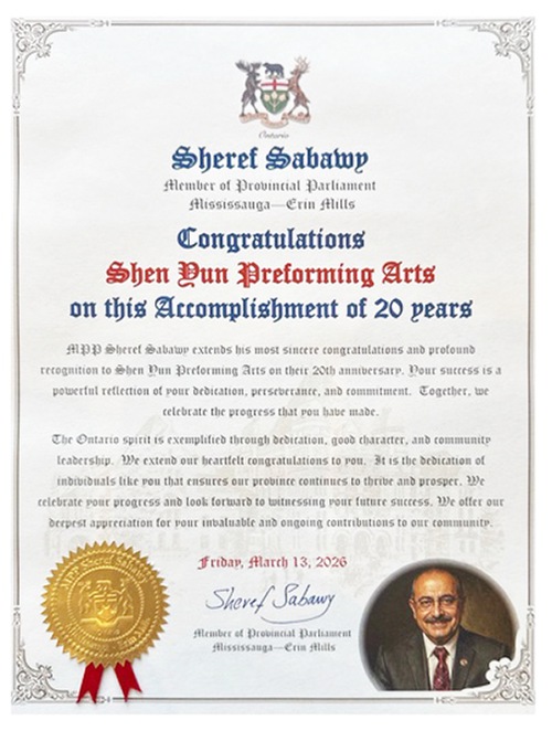 Sheref Sabawy, member of provincial parliament (MPP) for Mississauga-Erin Mills, wrote in his proclamation that he extends his sincere congratulations and recognition to Shen Yun Performing Arts on its 20th anniversary. “Your success is a powerful reflection of your dedication, perseverance, and commitment. Together, we celebrate the progress that you have made,” he wrote.