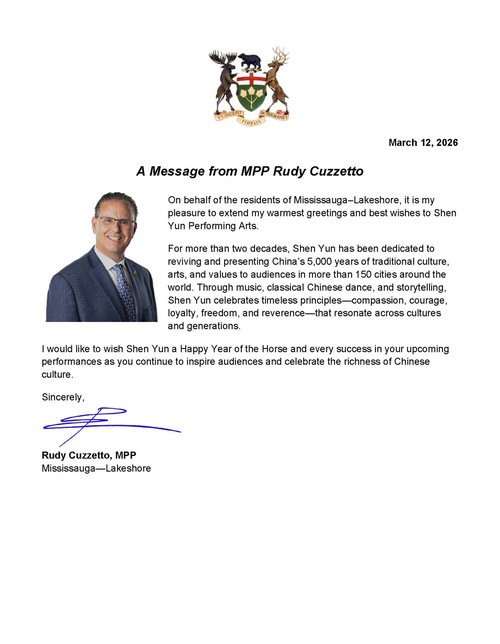 MPP Rudy Cuzzetto of Mississauga-Lakeshore wished Shen Yun success in its 2026 performances, and said the company continues, “To inspire audiences and celebrate the richness of Chinese culture.