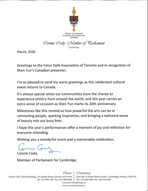 MP Connie Cody said milestones like Shen Yun’s 20th anniversary “remind us how powerful the arts can be in connecting people, sparking inspiration, and bringing a welcome sense of beauty into our busy lives.”