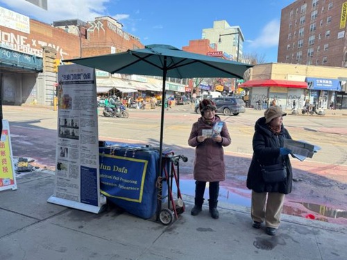 Practitioners in New York set up five booths on Main St. in Flushing, one of the city’s largest Chinese communities, to tell people about Falun Gong and to refute the CCP’s slanderous propaganda. Whatever the weather, they continue to tell people about Falun Gong and how the CCP persecutes it.