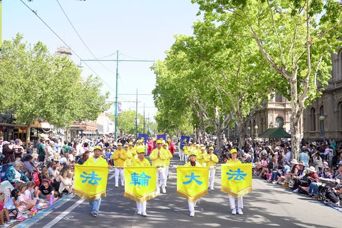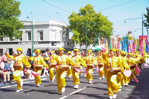 The parade officially began at 12:30 p.m. and the route was 5 km (3.1 miles) long. Around 100 practitioners from Melbourne and Sydney forming several major themes in the group took part in the parade. Spectators on both sides of the road clapped and cheered as practitioners marched past. From time to time, people could be heard exclaiming: “Falun Dafa!” “Authentic, traditional culture,” and, “You are amazing!”