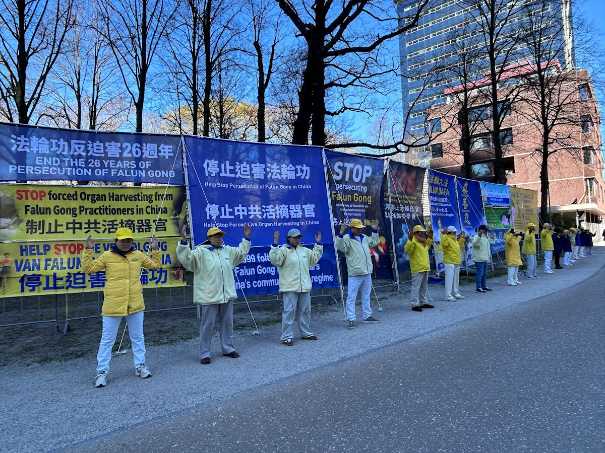 Practitioners displayed banners beside the temporary location of the House of Representatives—along the south side of Prinses Irenepad and the north side of the Bezuidenhoutseweg. The banners read: “Stop the Persecution of Falun Gong,” “26 Years of Falun Gong’s Resistance to Persecution,” “Stop Organ Harvesting and Murder of Falun Gong Practitioners,” “Falun Dafa Has Spread to Over 100 Countries, Benefiting the Minds and Bodies of Hundreds of Millions,” and “The World Needs Truthfulness-Compassion-Forbearance.”