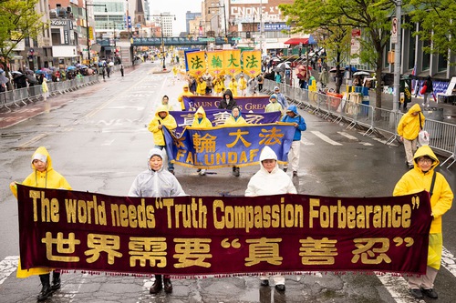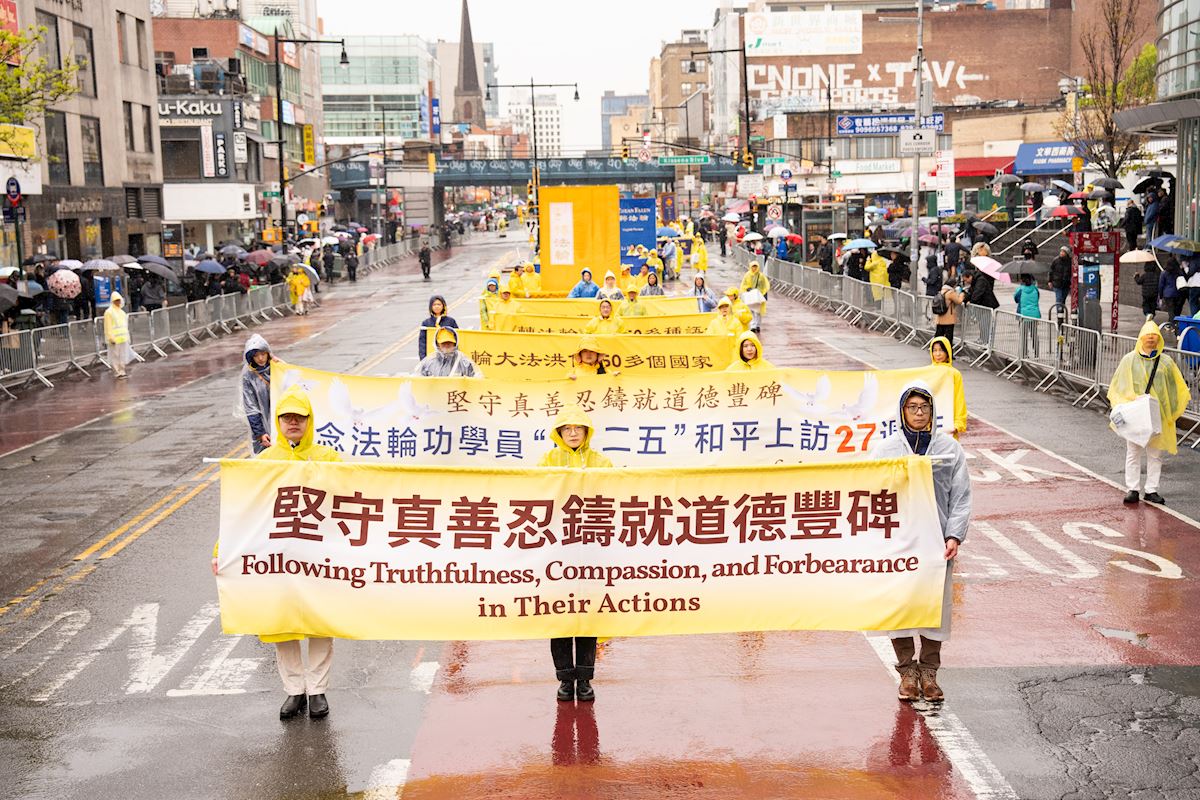 Falun Gong practitioners held a march on April 25 in downtown Flushing to commemorate the 27th anniversary of the peaceful appeal.