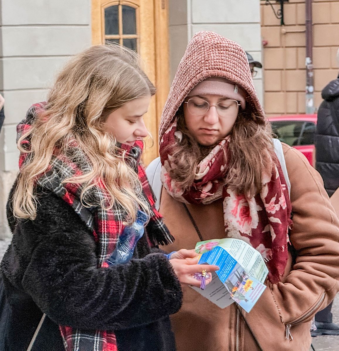 People accept flyers and talk with practitioners.