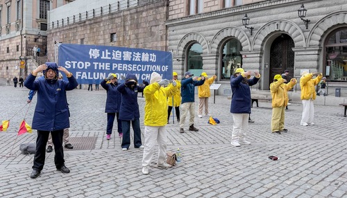 Practitioners went to Mynttorget Square beside Parliament at 1 p.m., did the exercises and collected signatures on a petition calling for an end to the persecution. They introduced the practice to the public and talked about the April 25 appeal in Beijing, the CCP’s persecution, and the CCP’s state-sanctioned forced organ harvesting.