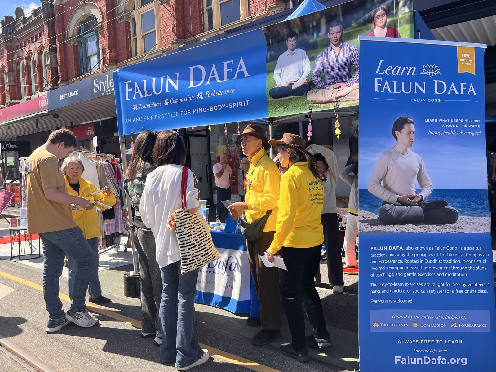 Residents and tourists learn about Falun Dafa.