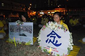 (Clearwisdom.net) On July 17, about 100 Falun Gong practitioners in Singapore held a candlelight vigil in memory of those who have lost their lives in the 10-year-long persecution of Falun Gong. They displayed a banner with the words, "Only dissolving the CCP can stop the persecution."